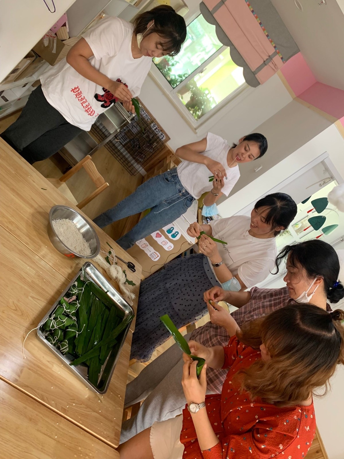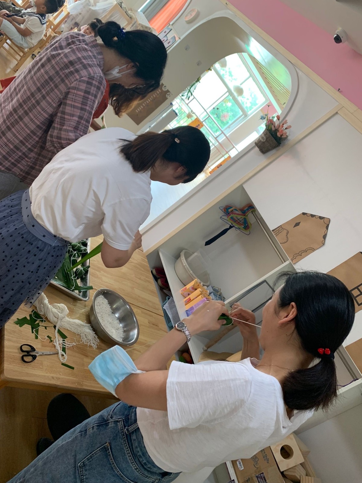 前期准备时,为了能教授孩子正确的包粽子的方法,老师们进行了相互的切磋学习,能看得出来,保育老师功劳不少,两三下功夫一个五角粽子变出来了,很厉害哦!