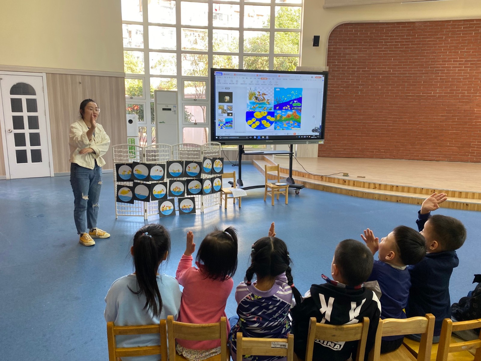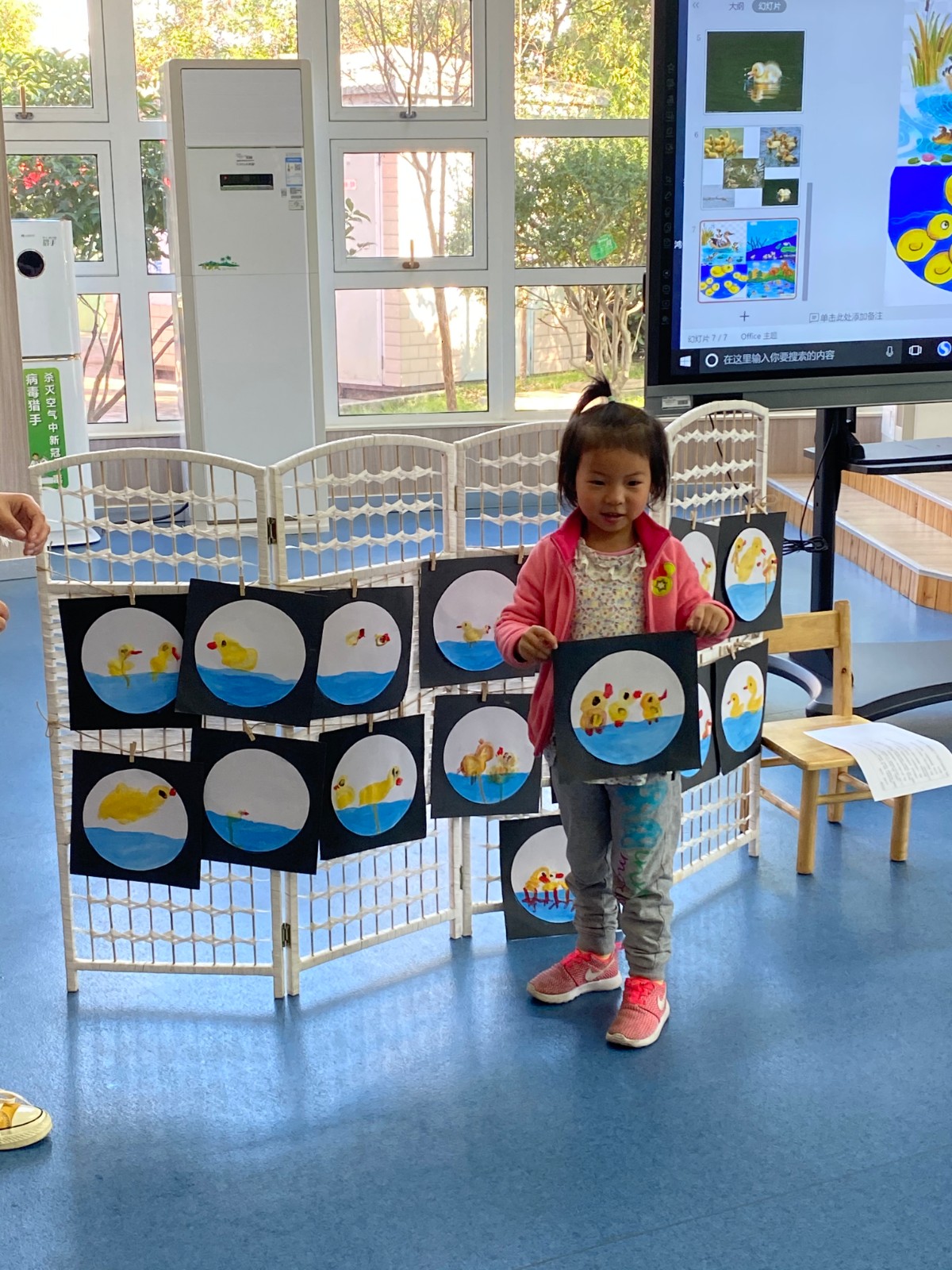 活动的第二环节,徐莹琳老师开展了一节中班班美术活动《池塘里的小鸭子》。徐莹琳老师利用PPT带幼儿观看池塘里的小鸭子,发现小鸭子的身体特征。活动中孩子们通过水粉绘画更加全面的了解小鸭子的形体特征。