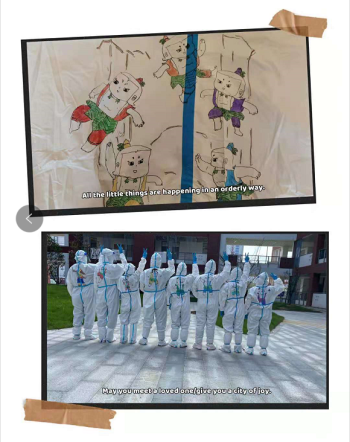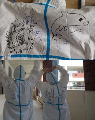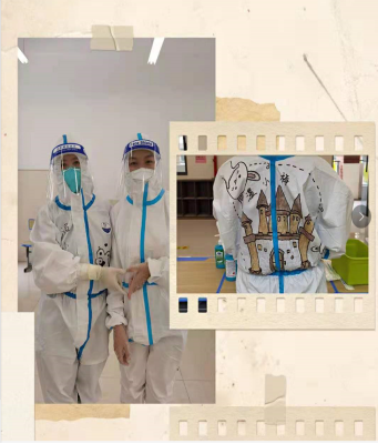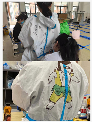 在疫情防控阻击战打响后,杭梦娇老师积极响应单位号召,主动向单位及街道申报志愿者,迅速投入到疫情防控战斗中。她先后在方山社区、永宁社区、泥塘社区进行志愿服务,用实际行动践行了“不忘初心,牢记使命”的精神实质。当南京开始组织大规模全员核酸检测时,根据防疫要求,居民小区采取了出示苏康码才可进入的规定,而她细心的发现,这一要求让上了年纪的爷爷奶奶们很头疼。于是,她帮助这些爷爷奶奶获取他们的苏康码并进行打印,使得他们进出小区更加便捷。接下来的核酸检测,她进入了检测点,接触到了医护人员,亲身体验了他们的辛苦。她穿上防护服,进行信息登记,一天14个小时,汗水浸透衣服,却没有半句怨言。在检测间隙,她为了帮助医护人员缓解疲惫,便提议组织大家在自己的防护服上作画,用一幅幅可爱的图画表达释放自己心中的感受。她充分发挥了幼儿园教师的特长,帮助医护人员完成了一幅又一幅作品。看着那些可爱的画面,医护人员疲惫的脸上露出了阳光般的笑容!