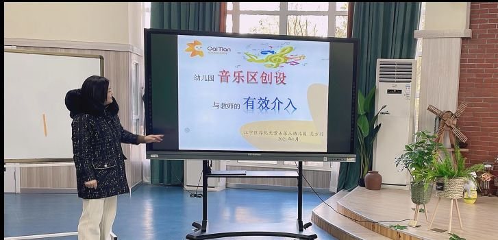 接着,由吴方羽老师为大家带来了主题为《幼儿园音乐区创设与教师的有效介入》讲座学习。方羽老师作为区音乐教研组的成员,凭借多年的教育教学经验,给我们带来一场精彩的讲座。她从“幼儿园音乐区的教育价值”、“目前音乐区存在的弊端”、“音乐区的设置及材料投放”,“教师的有效介入”四个方面进行了讲座分享。方羽老师用图文结合的形式,让我们更清楚直观地学习了理论知识。她指出环境创设一定要遵从动静分离,场地独立的原则来保证宽敞,通畅的空间。材料区的投放一定要适宜,适量,分类摆放。同时教师在指导时能帮助幼儿获得新经验,引导幼儿进行创造性表现。