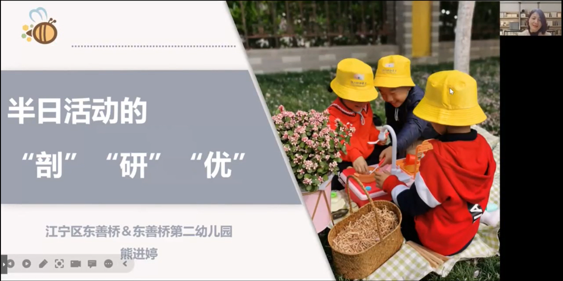 接着,由东善桥第二幼儿园熊进婷园长带来《半日活动组织的“剖”“研”“优”》精彩讲座。熊园长针对本园半日活动进行了“剖”“研”“优”三个方面的分享,通过多样诊断、制定计划、聚焦问题、教研相长 、同行向前、共话成长等方面,展示了幼儿园常态化的保教工作,如何优化幼儿园一日活动实施与组织、细化保教常规、进一步提高教师一日活动的组织与实施能力。最后,戴园长针对此次研讨活动作出了简要的总结,她提出老师们的课题研究来源于教育教学中的真问题,科研能力是实现其自身专业发展与智慧实践的关键能力。