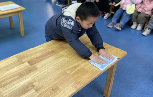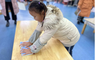 大班的孩子们个个斗志昂扬,信心满满,8个小朋友为一组,他们的两只小手抓住抹布在桌子上不停地上下来回擦,一眨眼的功夫,桌上就被擦的干净明亮啦!