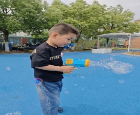 接下来,我们来到操场,开展了一场“泡泡奇遇记"的奇妙之旅。