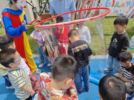 瞧,小丑们穿着五颜六色的衣服正在为小朋友画出一个大大的泡泡,小朋友站在里面,感受着泡泡的神奇,一起拍手,一起欢呼,留下合影。