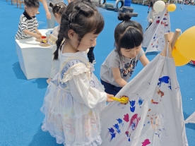 孩子们用各种形状的海绵印章、瓶盖、玩具等工具,蘸上七彩颜料,在小伞、帐篷、透明画布、白色衣服上留下漂亮的图案,看着漂亮的图案,他们开心极了,露出了甜甜的酒窝!