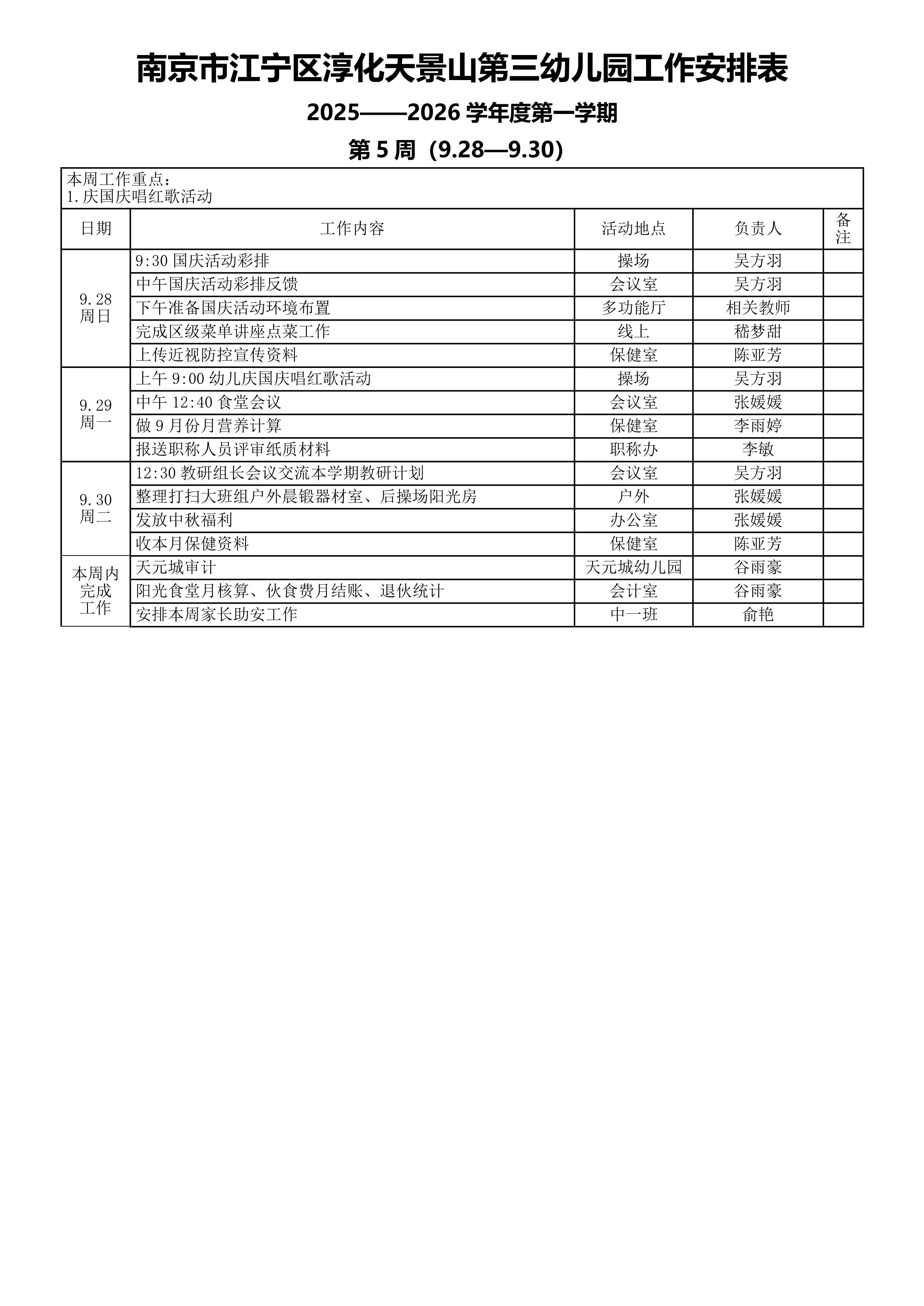 天景山第三幼儿园周工作安排表(第五周9.28-9.30)