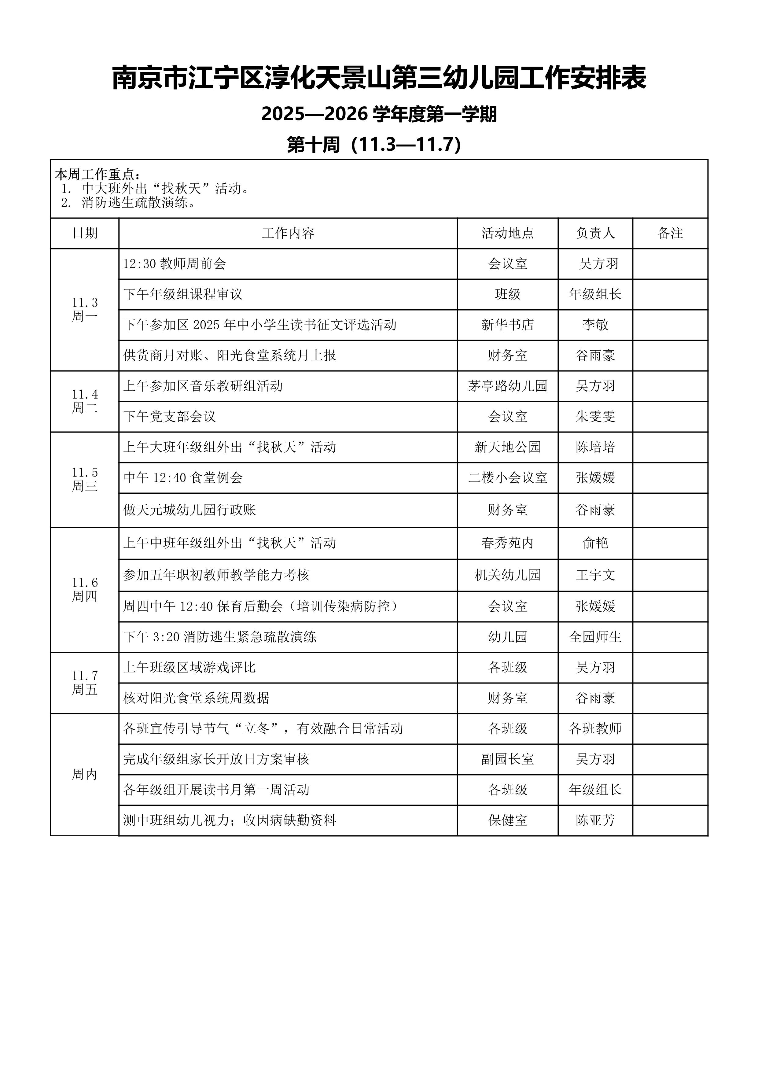 下一篇:天景山第三幼儿园周工作安排表(第十一周11.10-11.14)