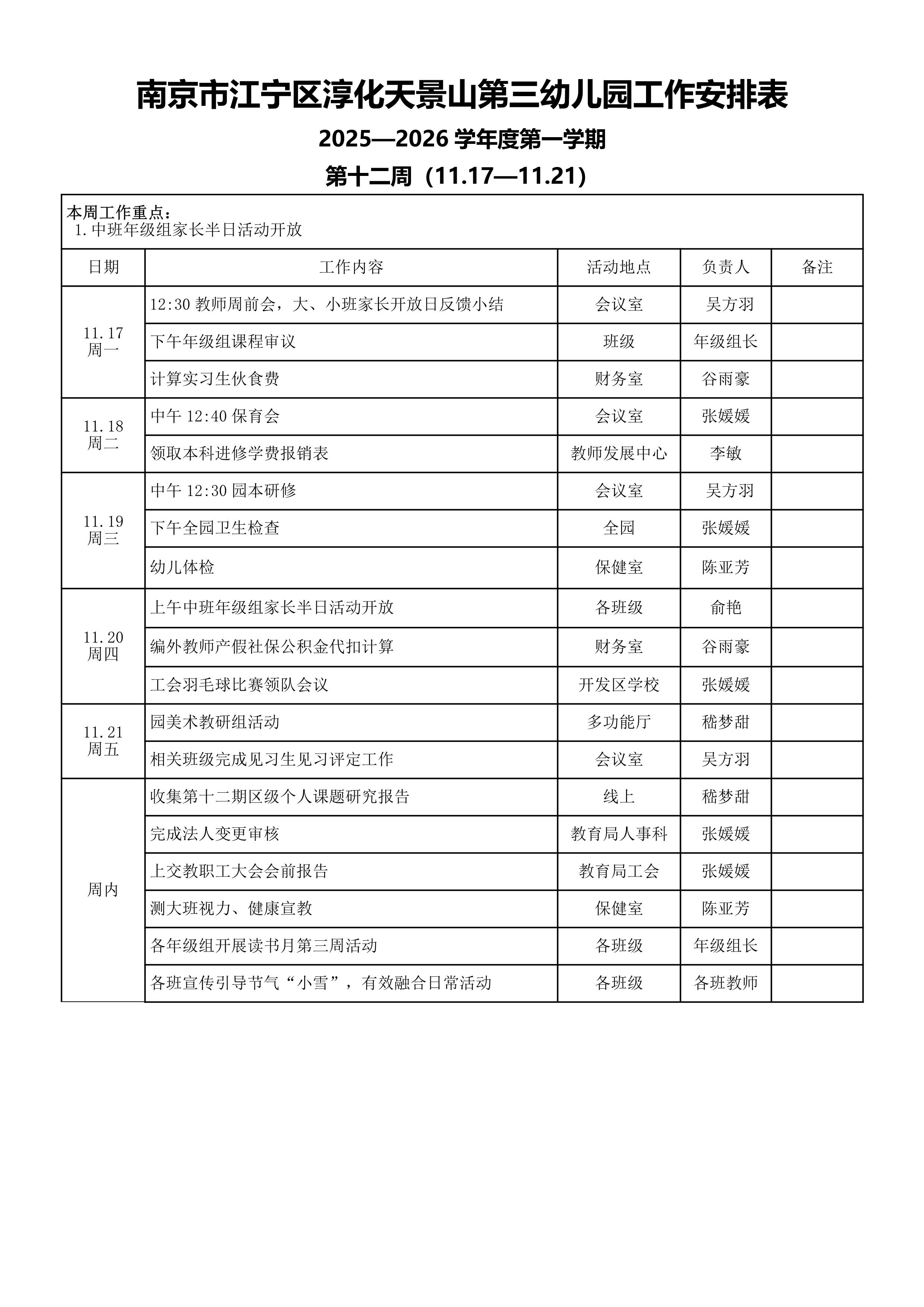 上一篇:天景山第三幼儿园周工作安排表(第十一周11.10-11.14)