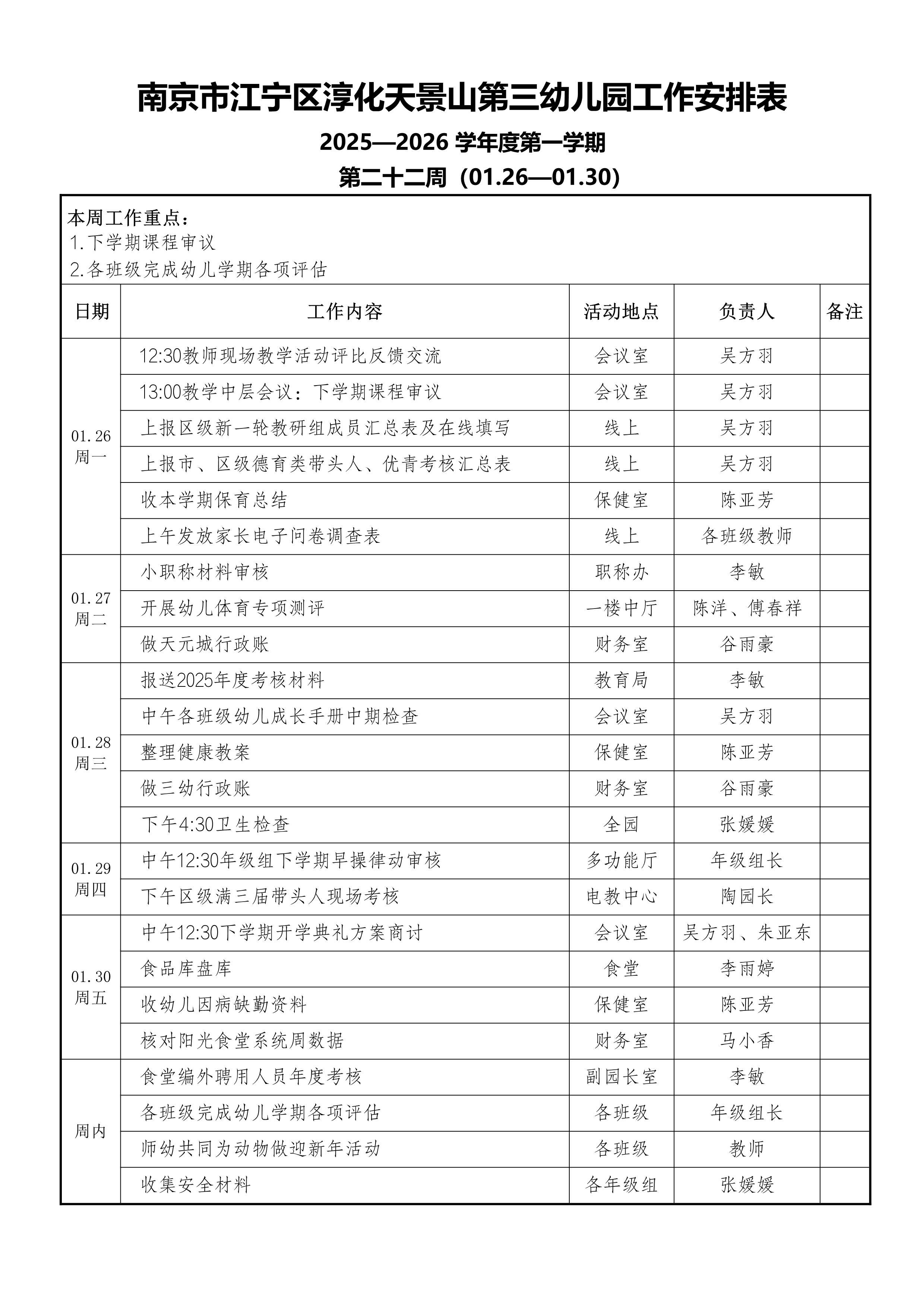 天景山第三幼儿园周工作安排表(第二十二周1.26-1.30)
