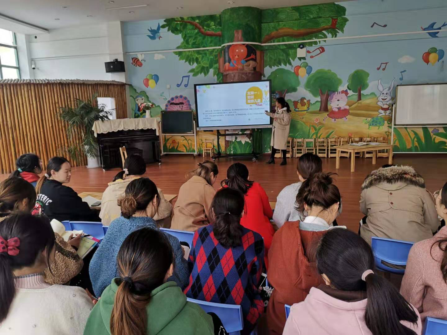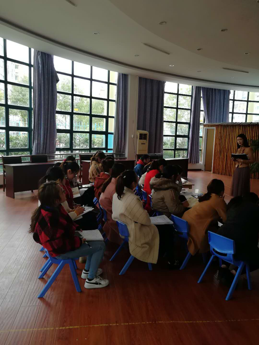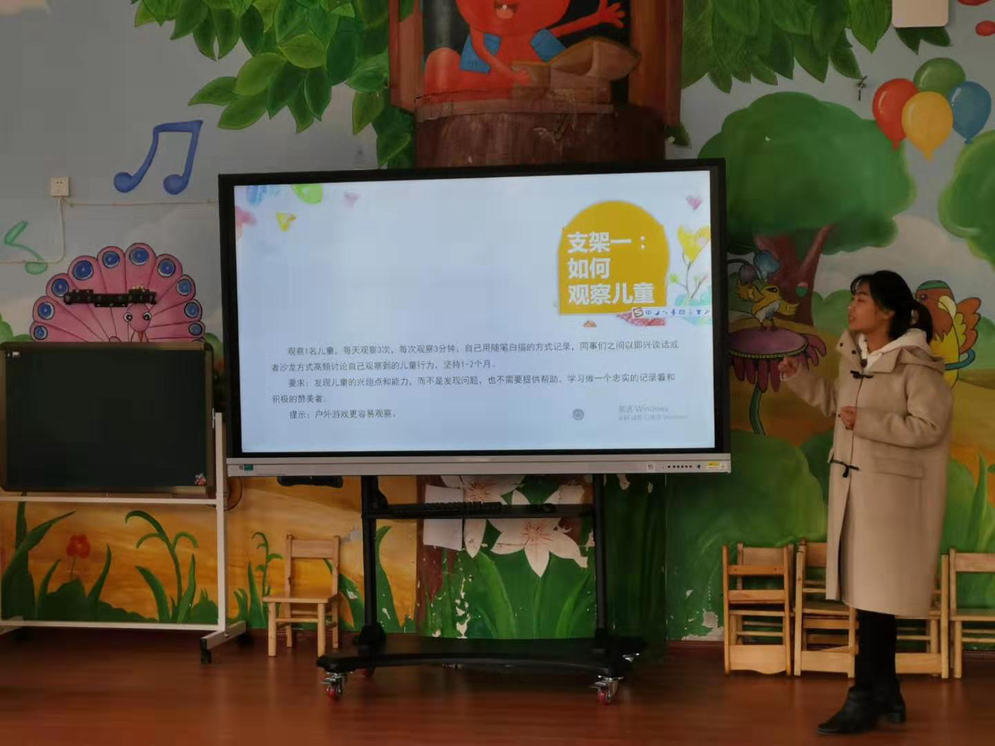 在进行一系列的讲解剖析之后,现场播放了一段中班孩子晨锻的视频,老师们观察看后写下自己的观察记录,然后进行分享、借鉴。最后夏园长还对观察记录的记录方法以及什么是白描式记录进行了详细的总结,让老师们进一步了解了应该怎样写观察记录。