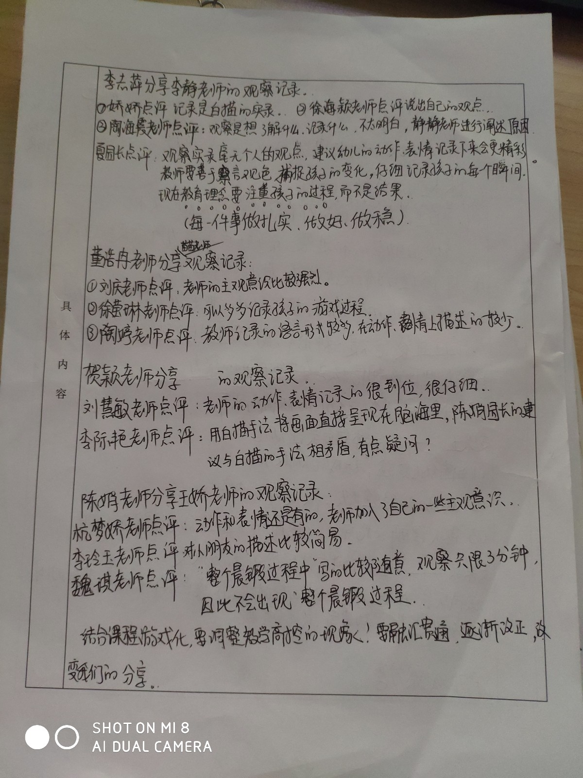 最后陈娟老师分享了娇娇老师的观察记录,小敏老师说:“老师的动作,表情记录的很到位,很仔细,但是加入了一些教师个人的主观意识。”琪琪老师点评说:“整个晨锻过程中”写的比较随意,观察一般只限3分钟,因此不会出现“整个晨锻过程”。